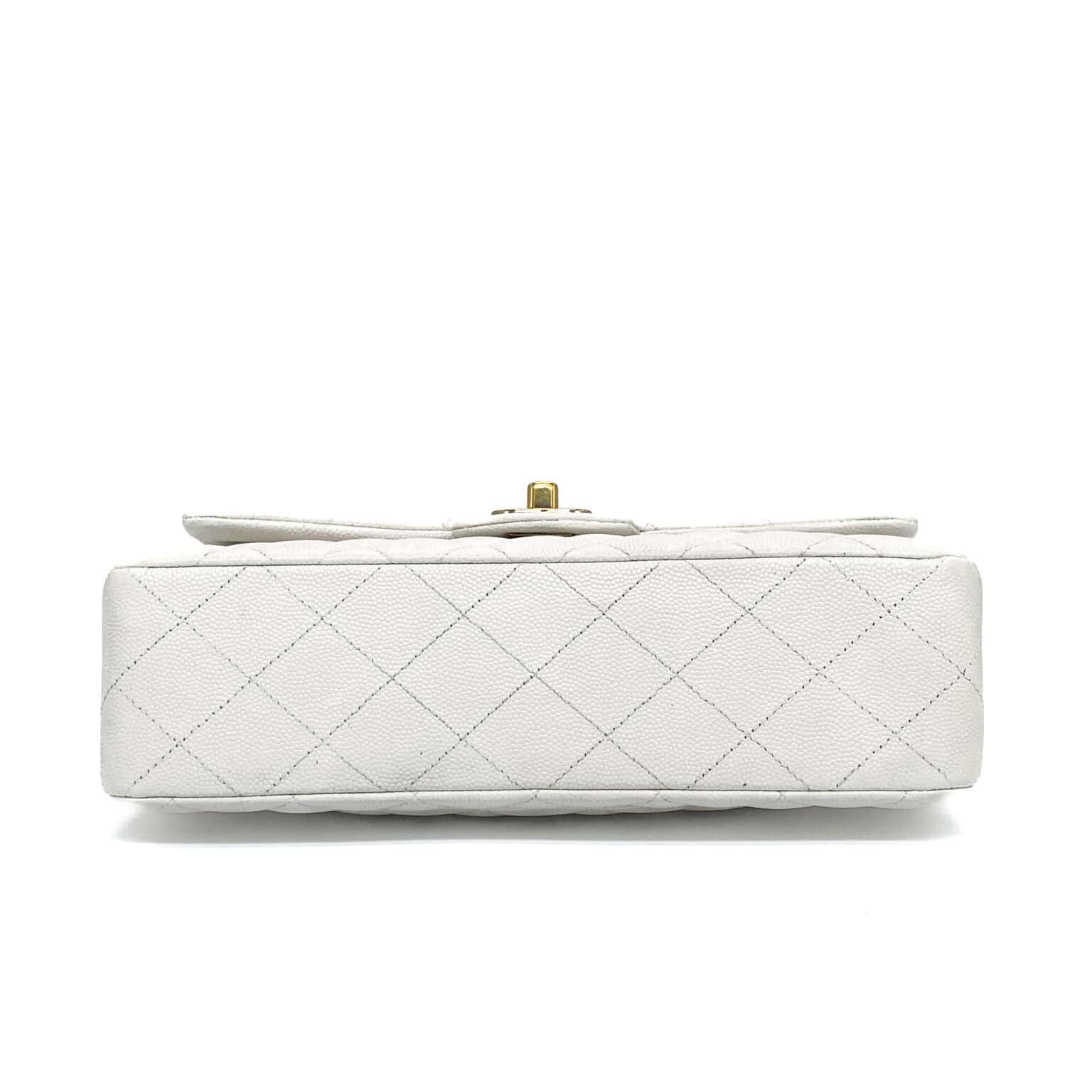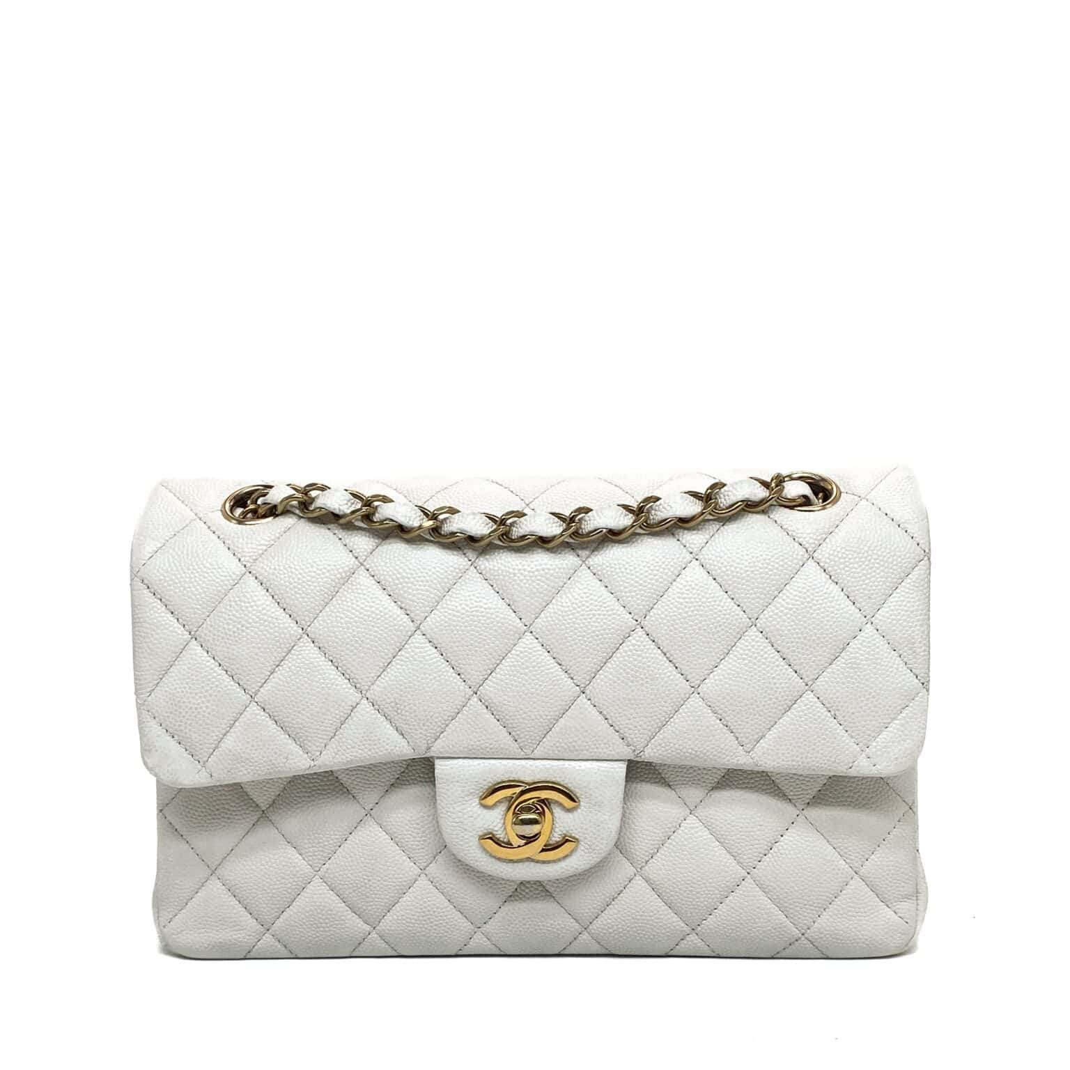Shine with sophisticated elegance with this women’s flap bag in bright white, designed to elevate every look with timeless allure. The gold-tone chain interlaced with leather adds a touch of feminine luxury, while the signature CC clasp serves as a symbol of enduring style.